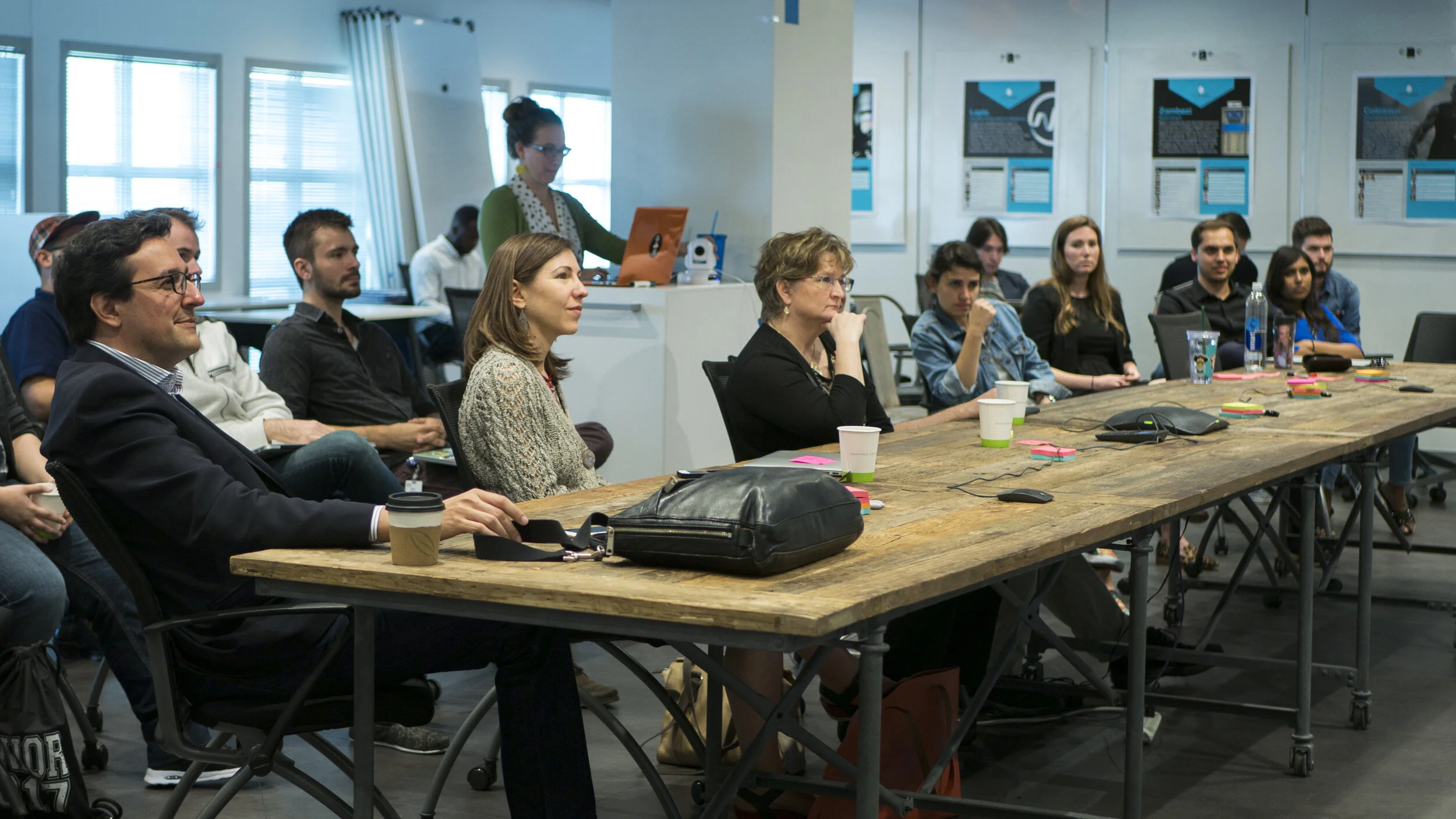 Executive sponsors Dr. Dario Gil and Dr. Ari Font (IBM Research) receive a final presentation by a team of early-career designers. My role in this moment is to orchestrate logistical details so that my team can shine.