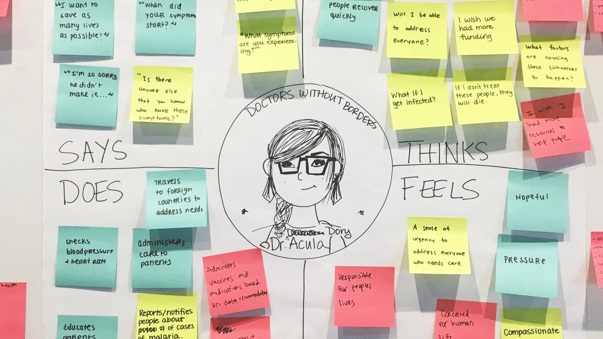An empathy map created by the team to help them formulate a holistic picture of people and their motivations, actions and feelings.